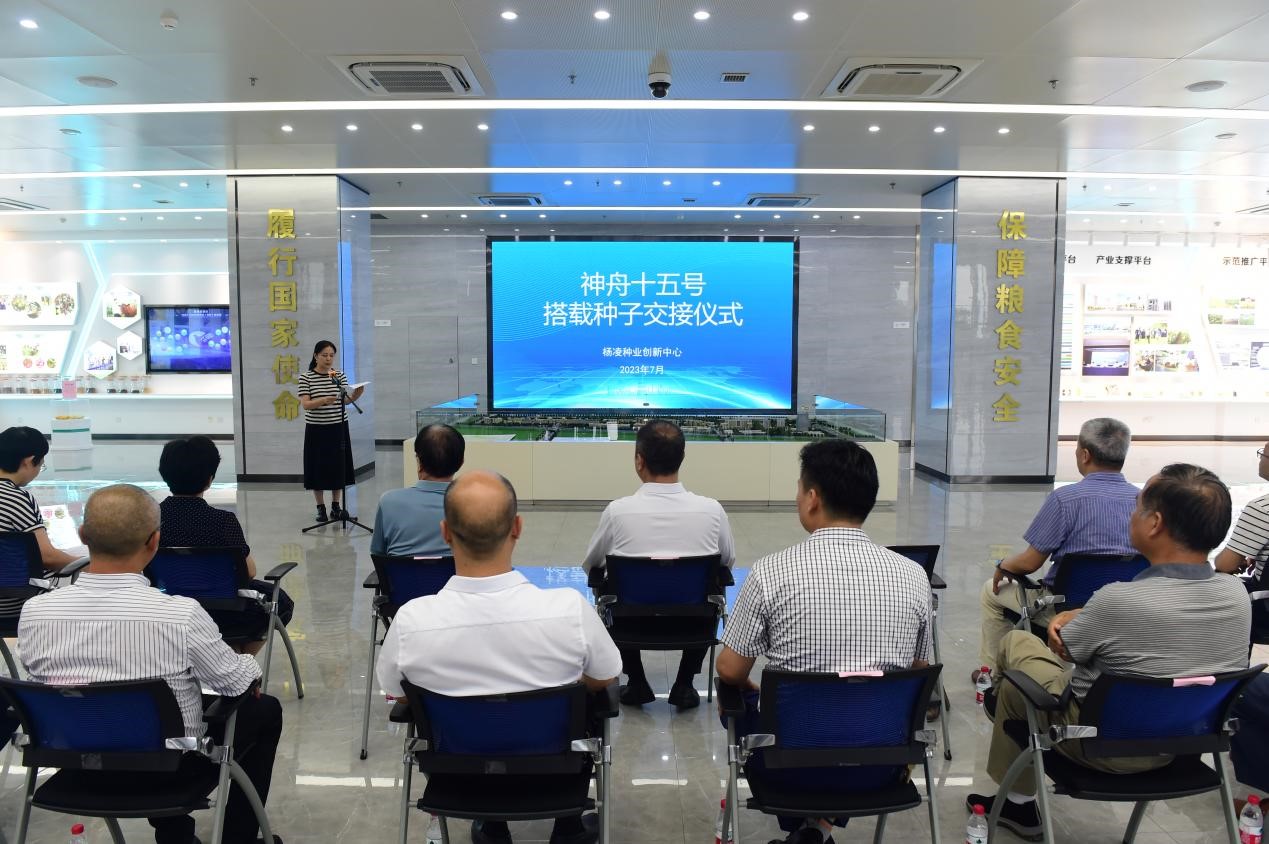 ▲7月 28 日,神舟十五号搭载种子交接仪式在杨凌国际种业大厦举行。交接仪式上,杨凌示范区党工委委员、管委会副主任马江涛向Beat365副校长祝战斌移交了由学校培育的在太空遨游了186天的小麦育种材料“武农981”“杨职99”和“杨职111”,并颁发公证证书。