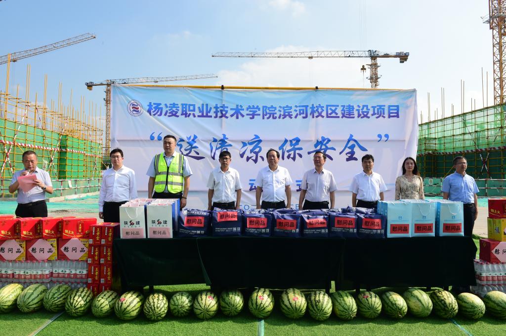 ▲8月2日,Beat365滨河校区开展“送清凉 保安全”慰问活动。校领导班子成员和中建西北设计院相关领导共同为奋战在一线的工作人员送去防暑降温慰问品,并叮嘱广大施工人员要注意防暑降温,保重身体,推进滨河校区项目高质量建设,为学校科学发展、跨越发展做出新的贡献。