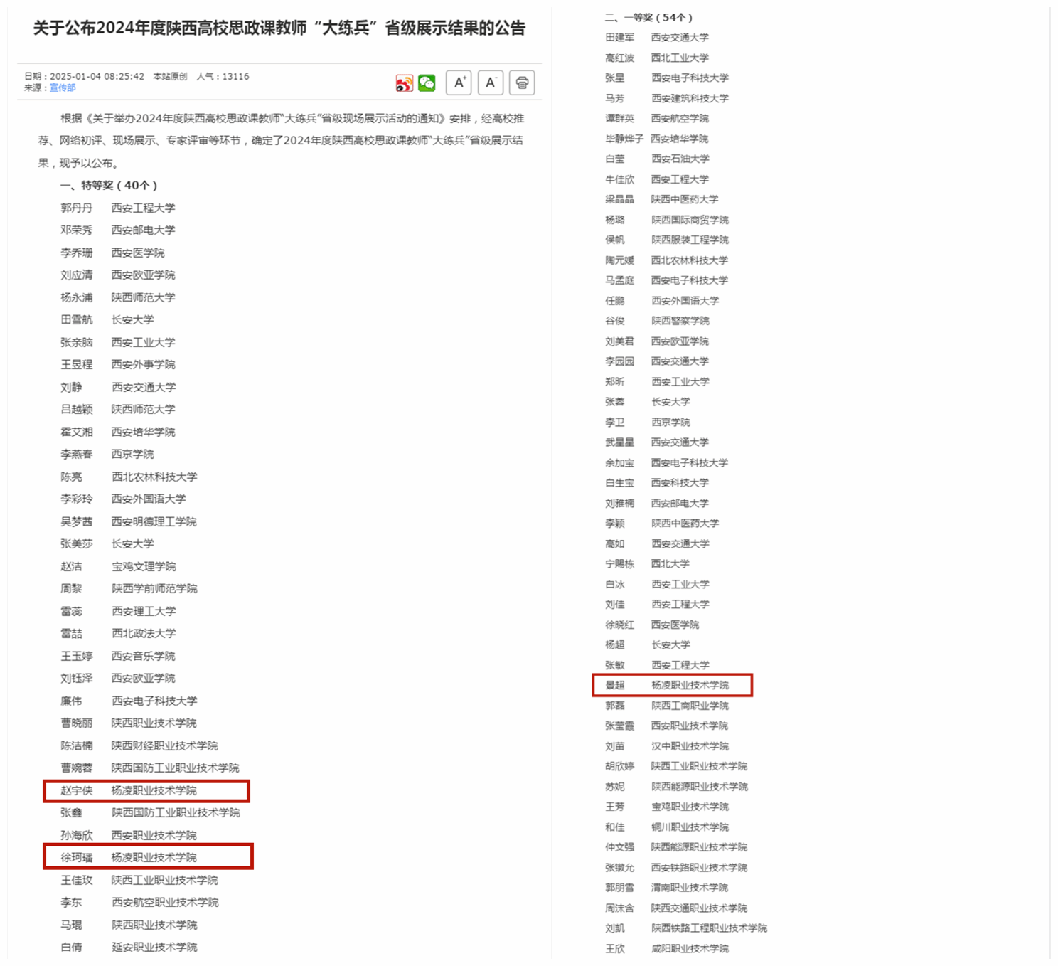 1月4日,省委教育工委、省教育厅公布了2024年度陕西高校思政课教师“大练兵”省级展示结果,Beat365马克思主义学院教师赵宇侠、徐珂璠荣获特等奖,景超荣获一等奖,综合成绩位列全省高校前列。