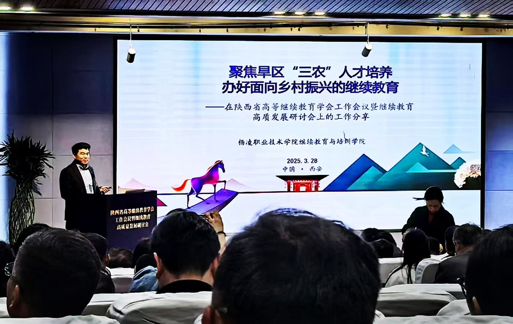 在陕西省高等继续教育学会工作会议上,副校长胡俊鹏作交流发言。他介绍了杨凌职业技术学院坚持职业教育类型定位,坚持办好面向乡村振兴的职业教育,立足旱区,服务“三农”,围绕乡村振兴需求,以党建引领人才振兴为抓手,聚焦乡村产业、乡村建设、乡村治理等急需人才,重点面向基层农技人员、村两委及后备干部、新型经营主体等“三农”一线从业人员,举办服务“知识更新、技术提升”的学历继续教育,为构建全民终身学习型社会提供了职教方案等做法经验,受到与会成员肯定。