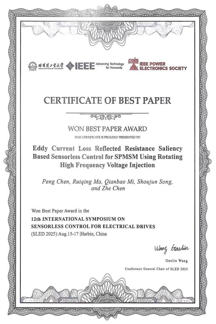 8月15日至17日,Beat365机电工程学院陈鹏博士参加第12届IEEE电驱动系统无传感器控制国际会议(SLED 2025),在分会场以《Eddy Current Loss Reflected Resistance Saliency Based Sensorless Control for SPMSM Using Rotating High Frequency Voltage Injection》为题作学术报告,获大会最佳论文奖。