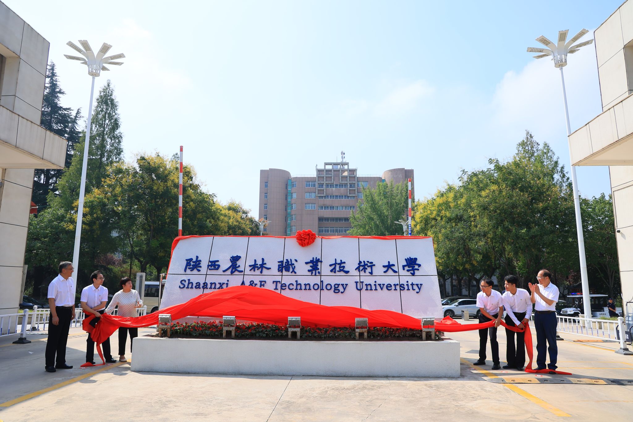 西北农林科技大学党委书记黄思光,杨凌示范区党工委书记史高领,省委教育工委委员、省教育厅副厅长吴振磊,党委书记韩明军共同为学校揭牌