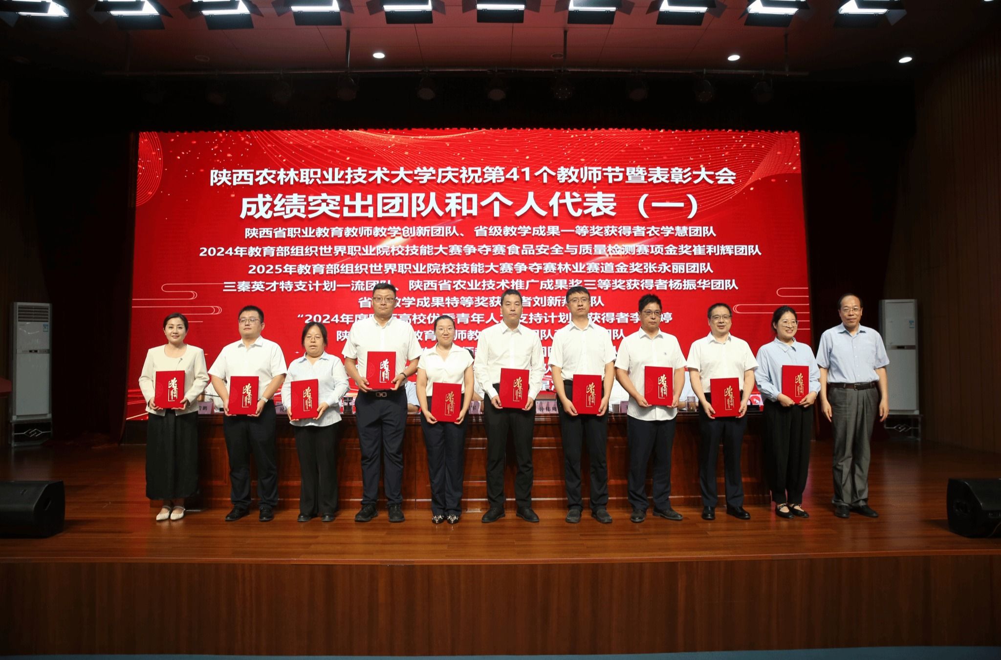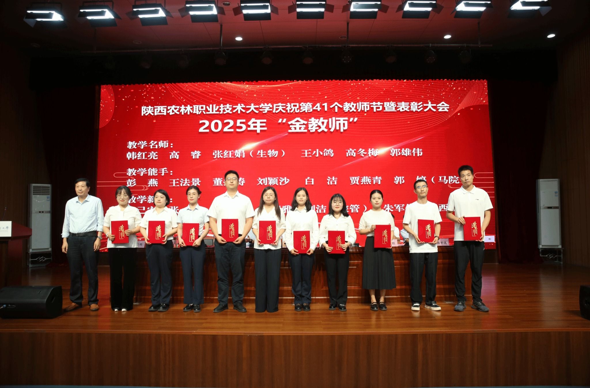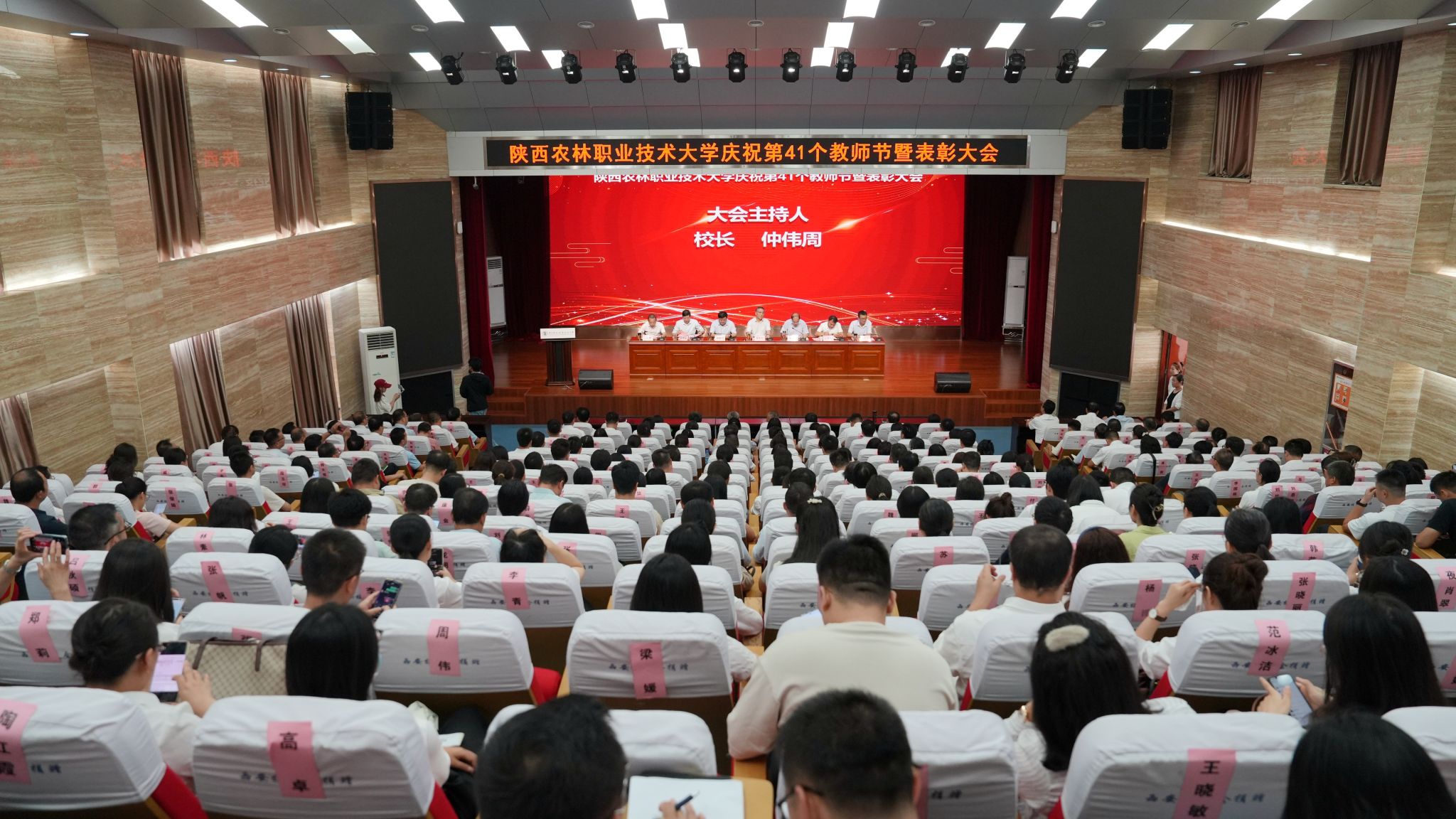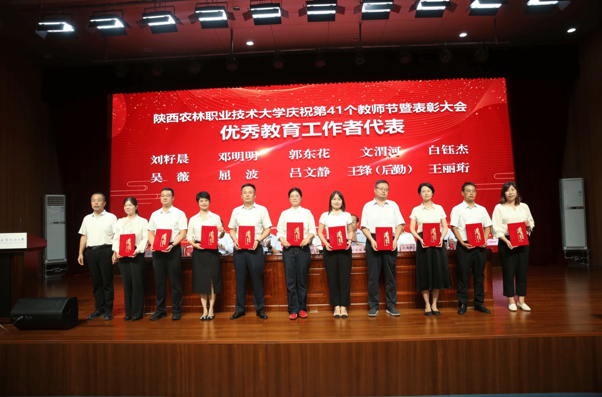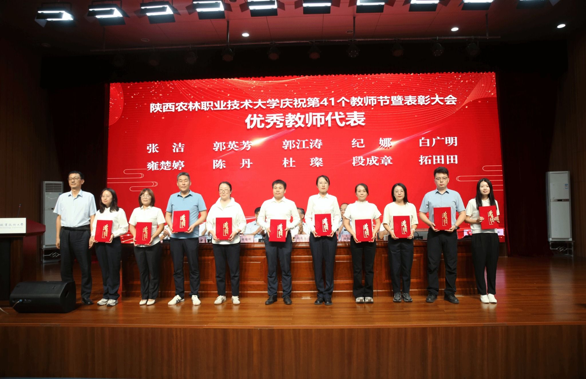 韩明军在讲话中向全体教职工致以诚挚的问候,向受表彰的教师表示热烈的祝贺,向所有爱国奉献、追求卓越的教职工表示衷心的感谢,向所有努力付出、辛勤工作的教职工致以最崇高的敬意。他要求,要大力弘扬践行教育家精神,树立“躬耕教坛、强国有我、兴校有我”的志向和抱负,努力做新时代德才兼备的“大先生”;要着力健全教师职业发展体系,切实树立教师第一资源、教师优先发展理念,全方位支持教师职业发展,让每一位教师力争都能成为本行业本领域的“大师”;要努力营造尊师重教的浓厚氛围,公开、公正、公平,把尊师重教落实在事关教师切实利益的工作实际中,积极主动为职工办实事,引导带领广大教职工把精力专注于教育教学工作上,体现在实实在在的业务成绩上。他希望,全体教职工要不负青春、不负韶华,不负党和人民的期盼,努力建设中国特色世界一流职业大学,续写学校事业发展的新篇章,在以中国式现代化全面推进强国建设、民族复兴伟业中贡献陕农力量。