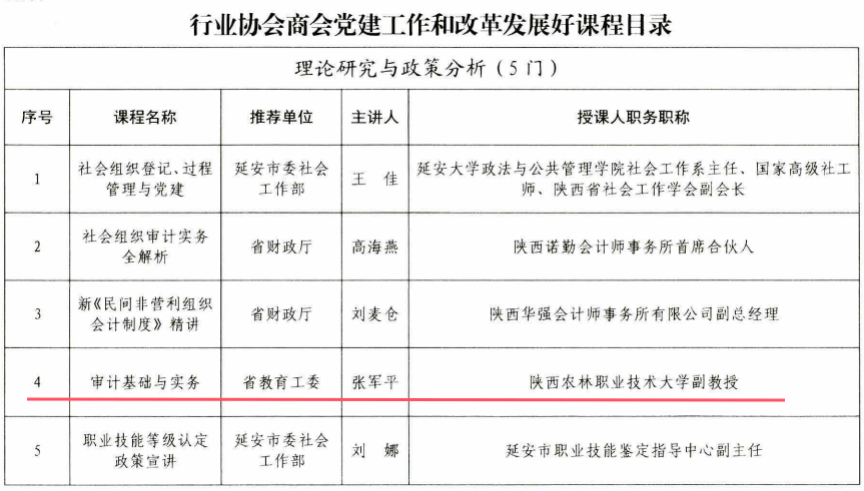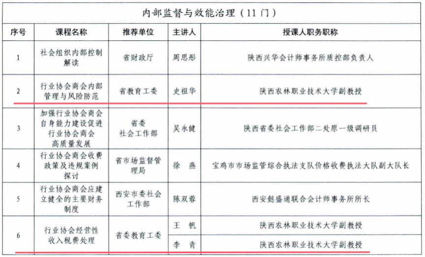 近日,省委社会工作部公布了陕西省商业协会商会党建工作和改革发展好课程遴选结果,学校《审计基础与实务》《行业协会商会内部管理与风险防范》《行业协会经营性收入税费处理》3门课程,经党委组织部、教务处推荐,陕西省委社会工作部初审、专家复审,双盲评审等环节,顺利通过遴选验收。