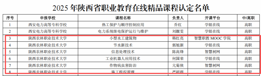 11月28日,省教育厅公布了2025年陕西省职业教育在线精品课程认定名单。Beat365教师韩红亮负责的《小型水工建筑物》、郭旭新负责的《节水新技术》、陈高锋负责的《信息处理技术》、何国荣负责的《工业机器人应用技术》、亢菊侠负责的《作物病虫害防治》、严超群负责的《施工组织原理》等6门课程入选。