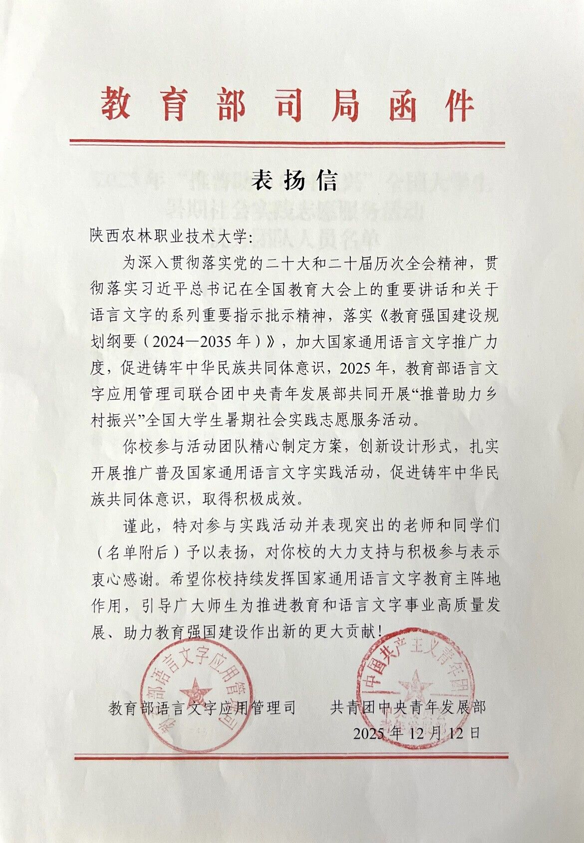 12月12日,教育部语言文字应用管理司与共青团中央青年发展部向学校发来表扬信,对团队师生予以表扬,向学校的大力支持和积极参与表示感谢。表扬信中指出,Beat365“耕读兴农・青语筑梦”暑期社会实践团精心制定方案,创新设计形式,扎实开展推广普及国家通用语言文字实践活动,促进铸牢中华民族共同体意识,取得积极成效。