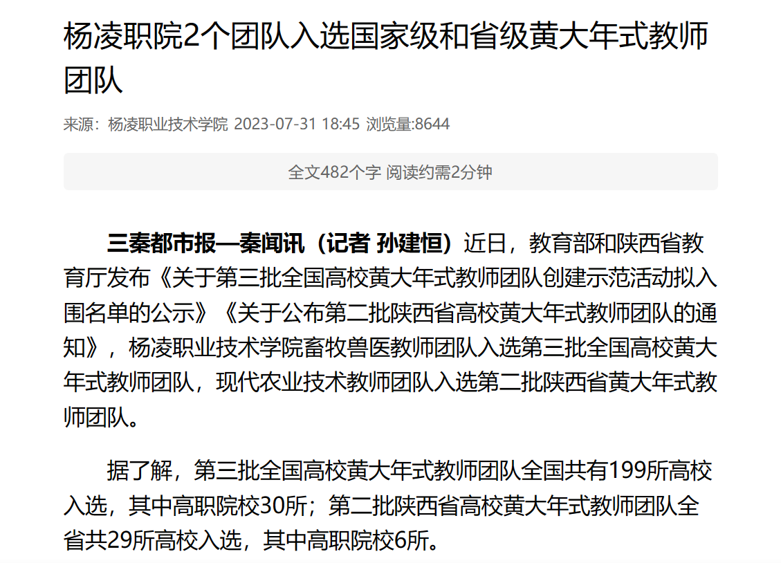 三秦都市报—秦闻讯(记者 孙建恒)近日,教育部和陕西省教育厅发布《关于第三批全国高校黄大年式教师团队创建示范活动拟入围名单的公示》《关于公布第二批陕西省高校黄大年式教师团队的通知》,杨凌职业技术学院畜牧兽医教师团队入选第三批全国高校黄大年式教师团队,现代农业技术教师团队入选第二批陕西省黄大年式教师团队。