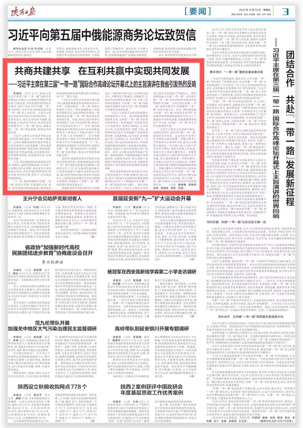 【陕西日报】共商共建共享 在互利共赢中实现共同发展——习近平主席在第三届“一带一路”国际合作高峰论坛开幕式上的主旨演讲在我省引发热烈反响