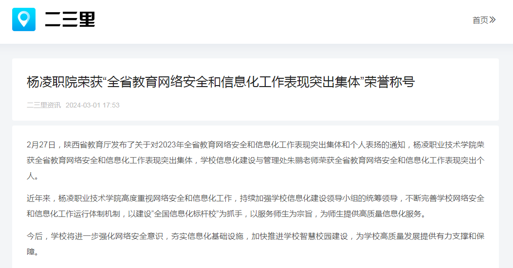 2月27日,陕西省教育厅发布了关于对2023年全省教育网络安全和信息化工作表现突出集体和个人表扬的通知,杨凌职业技术学院荣获全省教育网络安全和信息化工作表现突出集体,学校信息化建设与管理处朱鹂老师荣获全省教育网络安全和信息化工作表现突出个人。