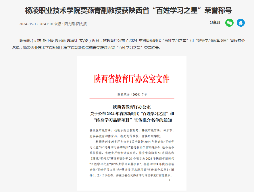 近日,省教育厅公布了2024 年省级新时代“百姓学习之星”和“终身学习品牌项目”宣传推介名单,杨凌职业技术学院动物工程学院副教授贾燕青荣获陕西省“百姓学习之星”荣誉称号。