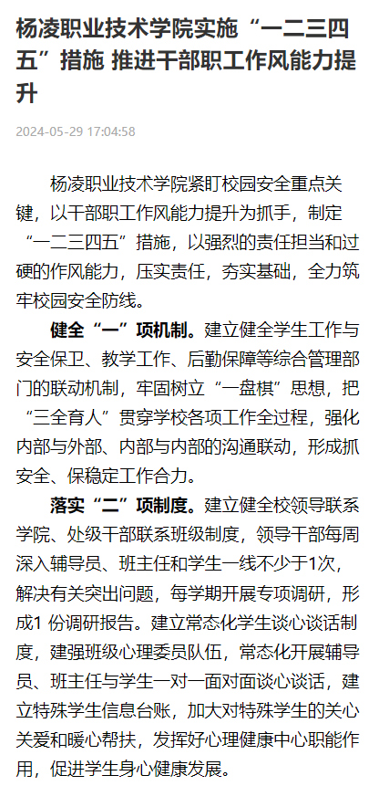 杨凌职业技术学院紧盯校园安全重点关键,以干部职工作风能力提升为抓手,制定“一二三四五”措施,以强烈的责任担当和过硬的作风能力,压实责任,夯实基础,全力筑牢校园安全防线。
