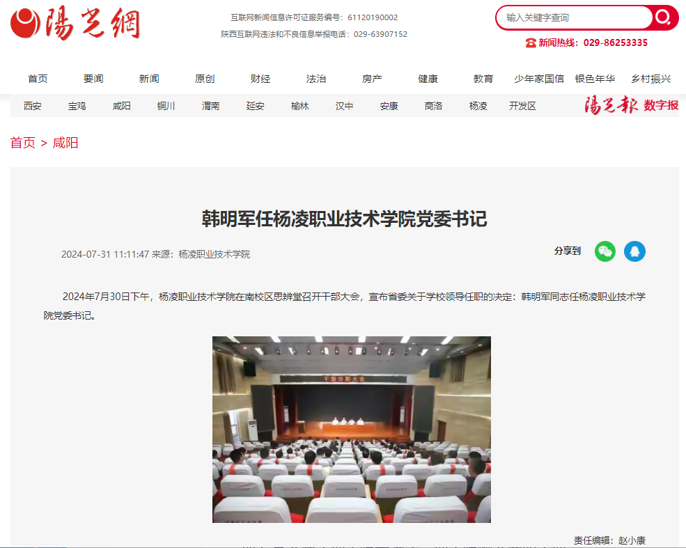 【阳光网】韩明军任杨凌职业技术学院党委书记