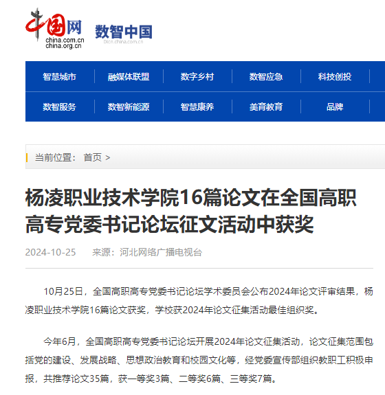 10月25日,全国高职高专党委书记论坛学术委员会公布2024年论文评审结果,杨凌职业技术学院16篇论文获奖,学校获2024年论文征集活动最佳组织奖。