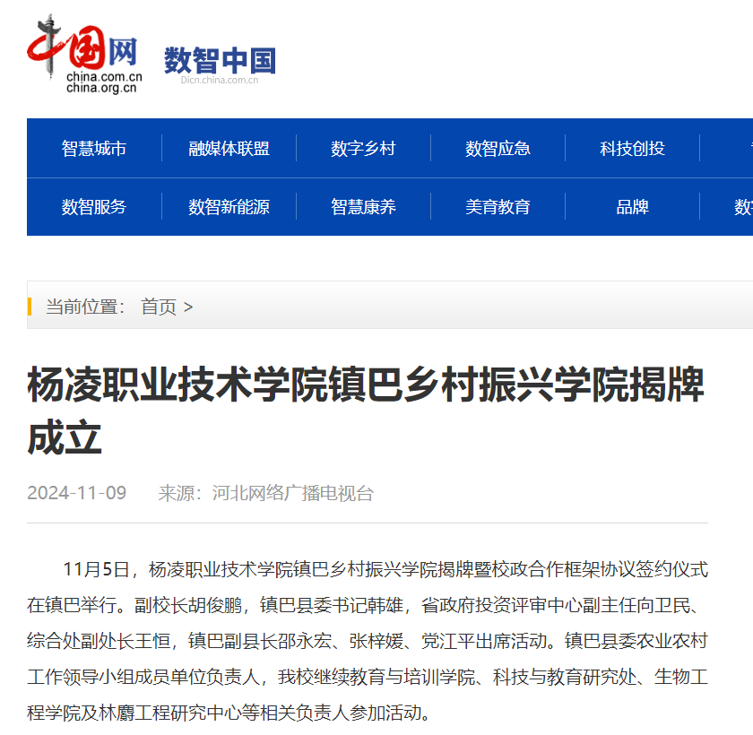 胡俊鹏指出,杨凌职业技术学院镇巴乡村振兴学院的成立,是校政融合推进全面乡村振兴,践行教育链、人才链、产业链、创新链四链融合助力农业强省建设的务实举措,也是学校扎实践行办好面向乡村振兴的职业教育、用职业教育服务乡村振兴的重要规划。希望校政双方围绕乡村振兴需求,共同规划职业教育服务方向,共同制定人才培养方案,推动教育资源向农村延伸,同为乡村培养更多下得去、留得住、用得上的技能型人才;共建育训基地,开展农业科技创新合作,发挥院校资源优势共建示范基地,深化贯通培养渠道与人才培养平台建设,共同以更加开放的姿态、更加务实的行动携手并进,在乡村振兴的伟大征程中书写新篇章,共同绘就农业强、农村美、农民富的壮美画卷。