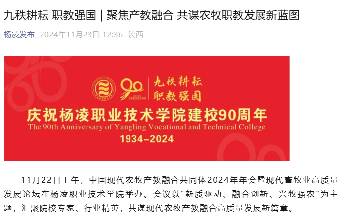 11月22日上午,中国现代农牧产教融合共同体2024年年会暨现代畜牧业高质量发展论坛在杨凌职业技术学院举办。会议以“新质驱动、融合创新、兴牧强农”为主题,汇聚院校专家、行业精英,共谋现代农牧产教融合高质量发展新篇章。