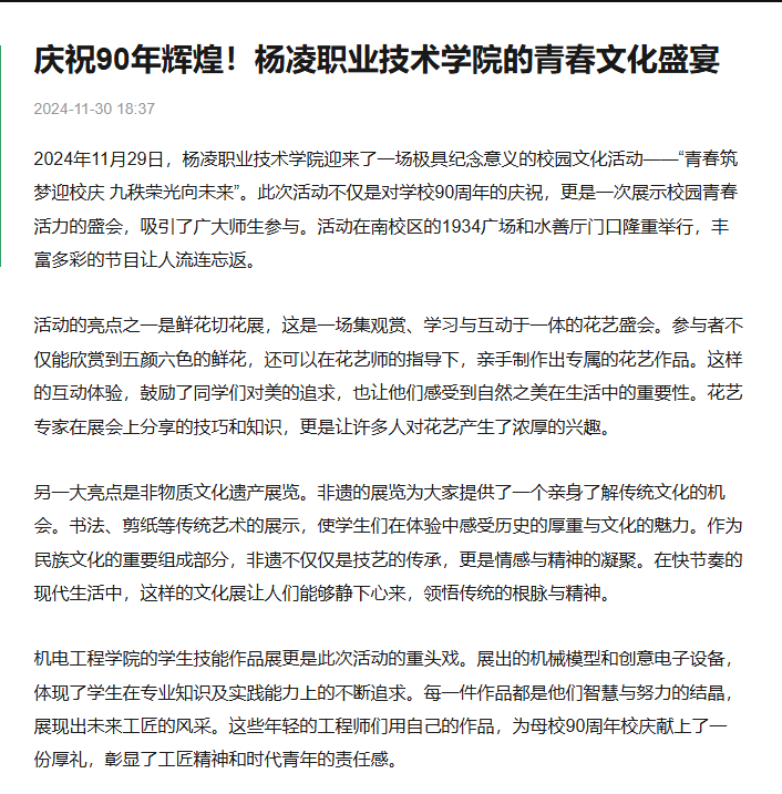 杨凌职业技术学院在90年的发展历程中,培养了一批又一批优秀人才。此次“青春筑梦迎校庆”主题活动,充分展现了学校教育的创新与传承,激励着无数年轻学子在未来的道路上,继续发扬光大,书写新的辉煌篇章。校园文化的繁荣与活力,无疑是不断传承与创新的成果,今日的展现必将为未来的发展注入强劲的动力。