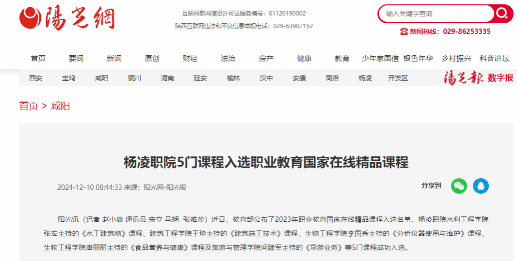 【阳光网】杨凌职院5门课程入选职业教育国家在线精品课程
