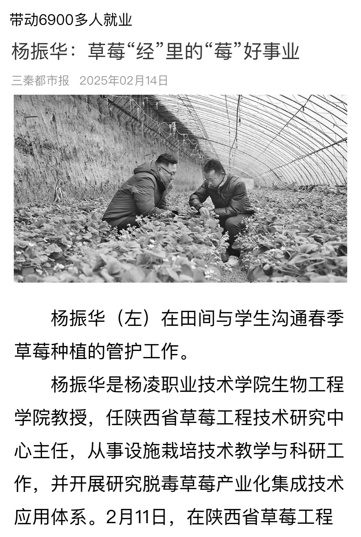 近年来,杨振华团队利用陕西省草莓工程技术研究中心进行科技示范推广,将科学化的管理模式进行线上线下培训,“新机立智”体系已拓展至陕西、甘肃等地农业生产前沿,技能培训人数达到15760人,带动就业人数6900多人,实现农业产业增收1.2亿元。