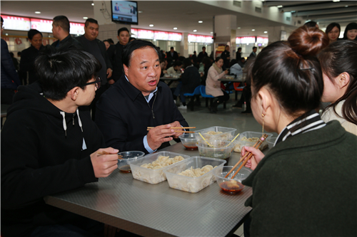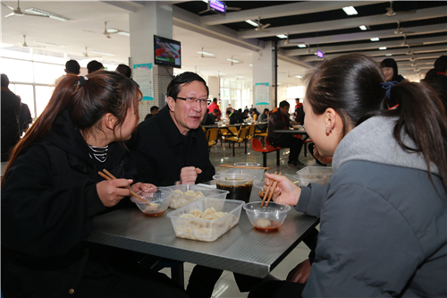上午10点半在杨凌职院南校区餐厅,已有不少学生陆续拿着餐券在各个橱窗前排队等候,不一会儿,一盘盘热腾腾的饺子就已上桌。吃着热腾腾的饺子,大家有说有笑。到了中午用餐时间,该院领导赵曼、王周锁、任得元、张永良、刘粉莲、张迪和著名小麦育种专家赵瑜研究员也相继来到南、西、北三个校区的餐厅,与学生们一起吃饺子、过冬至。