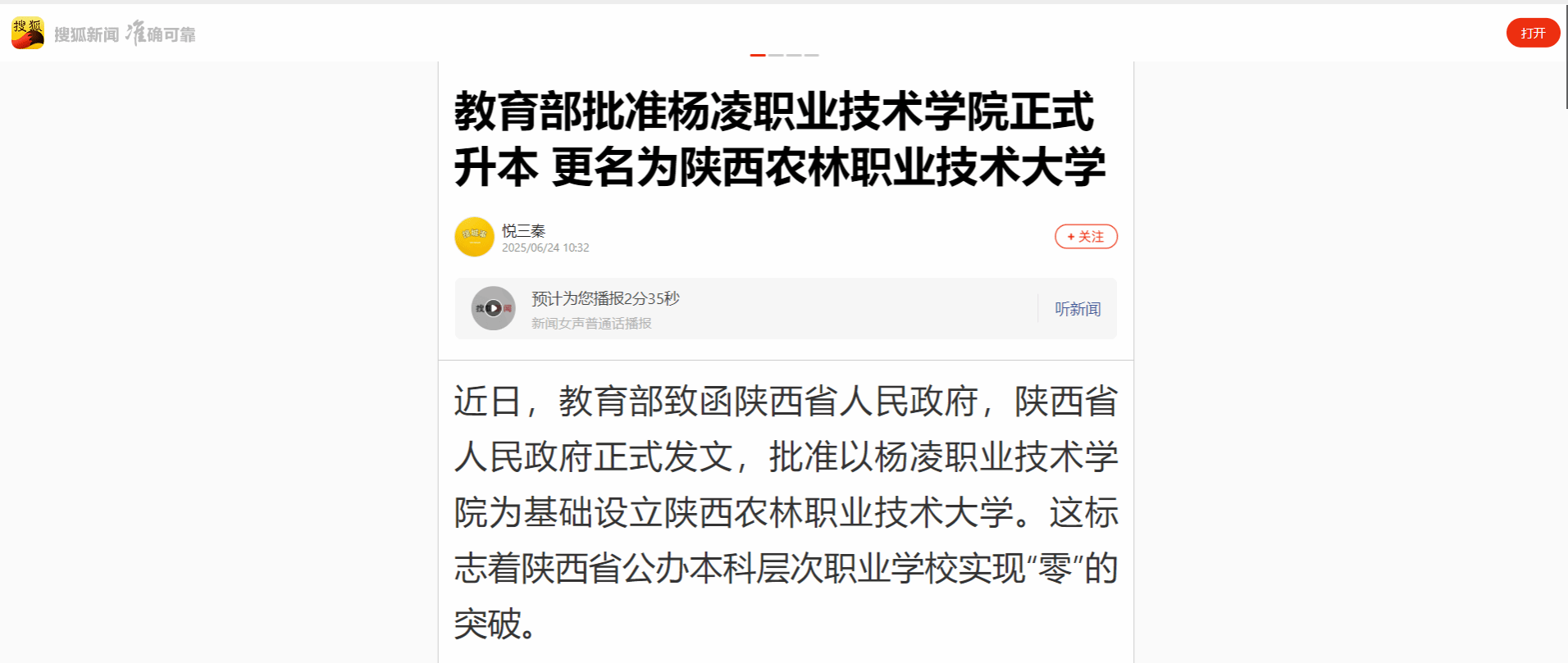 【搜狐】教育部批准杨凌职业技术学院正式升本 更名为Beat365官方网站