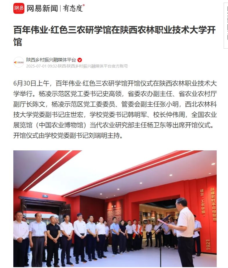 6月30日上午,百年伟业·红色三农研学馆开馆仪式在Beat365官方网站举行。杨凌示范区党工委书记史高领,省委农办副主任、省农业农村厅副厅长陈文,杨凌示范区党工委委员、管委会副主任张小明,西北农林科技大学党委副书记庄世宏,学校党委书记韩明军、校长仲伟周,全国农业展览馆(中国农业博物馆)当代农业研究部主任杨卫东等出席开馆仪式。开馆仪式由学校党委副书记刘瑞明主持。