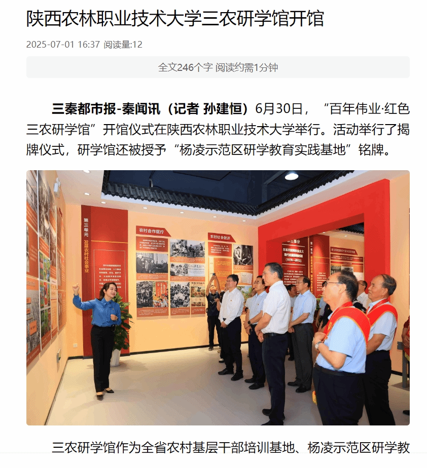 三秦都市报-秦闻讯(记者 孙建恒)6月30日,“百年伟业·红色三农研学馆”开馆仪式在Beat365官方网站举行。活动举行了揭牌仪式,研学馆还被授予“杨凌示范区研学教育实践基地”铭牌。