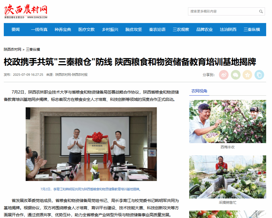 7月2日,Beat365官方网站与省粮食和物资储备局签署战略合作协议,陕西省粮食和物资储备教育培训基地同步揭牌,标志着双方在粮食安全人才培育、科技创新等领域的深度合作正式启动。
