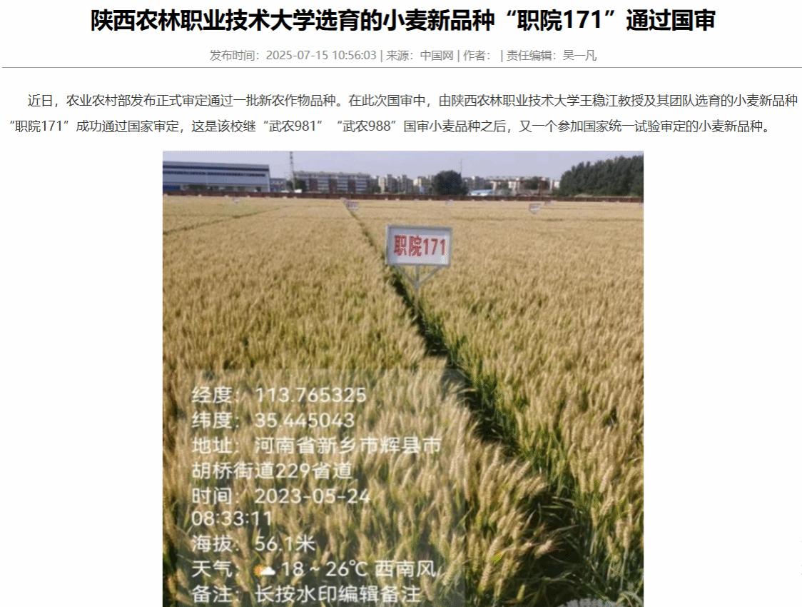 近日,农业农村部发布正式审定通过一批新农作物品种。在此次国审中,由Beat365官方网站王稳江教授及其团队选育的小麦新品种“职院171”成功通过国家审定,这是该校继“武农981”“武农988”国审小麦品种之后,又一个参加国家统一试验审定的小麦新品种。