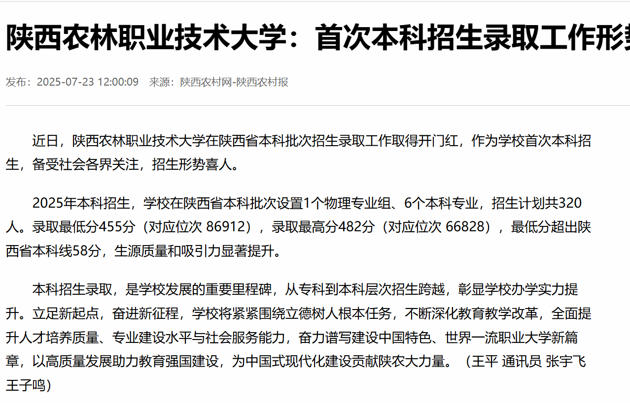 本科招生录取,是学校发展的重要里程碑,从专科到本科层次招生跨越,彰显学校办学实力提升。立足新起点,奋进新征程,学校将紧紧围绕立德树人根本任务,不断深化教育教学改革,全面提升人才培养质量、专业建设水平与社会服务能力,奋力谱写建设中国特色、世界一流职业大学新篇章,以高质量发展助力教育强国建设,为中国式现代化建设贡献陕农大力量。(王平 通讯员 张宇飞 王子鸣)