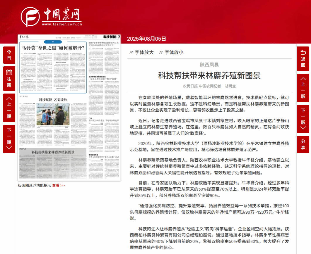 科技的注入让林麝养殖从“经验主义”转向“科学运营”,企业盈利空间大幅拓展。陕西秦柏林麝良种繁育有限公司总经理柏超说,通过基地技术指导,林麝季节性疾病患病率从原来的40%下降到目前的20%,繁殖双胎率由50%提高到80%,极大提升了发展林麝养殖产业的信心。
