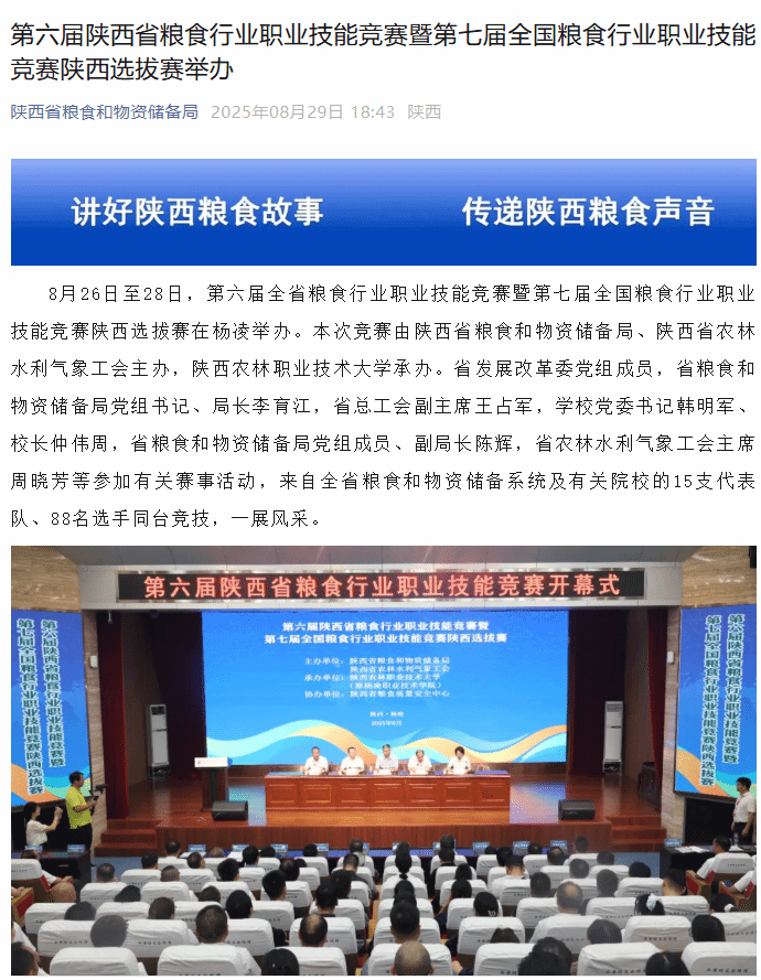 8月26日至28日,第六届全省粮食行业职业技能竞赛暨第七届全国粮食行业职业技能竞赛陕西选拔赛在杨凌举办。本次竞赛由陕西省粮食和物资储备局、陕西省农林水利气象工会主办,Beat365官方网站承办。省发展改革委党组成员,省粮食和物资储备局党组书记、局长李育江,省总工会副主席王占军,学校党委书记韩明军、校长仲伟周,省粮食和物资储备局党组成员、副局长陈辉,省农林水利气象工会主席周晓芳等参加有关赛事活动,来自全省粮食和物资储备系统及有关院校的15支代表队、88名选手同台竞技,一展风采。