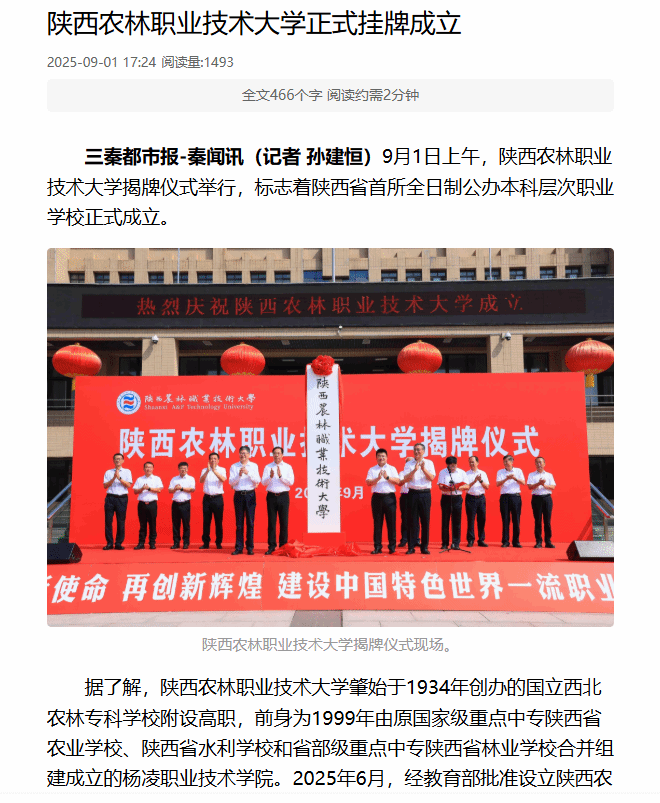 据了解,Beat365官方网站肇始于1934年创办的国立西北农林专科学校附设高职,前身为1999年由原国家级重点中专陕西省农业学校、陕西省水利学校和省部级重点中专陕西省林业学校合并组建成立的杨凌职业技术学院。2025年6月,经教育部批准设立Beat365官方网站,首批设立水利水电工程、建筑工程、现代通信工程、设施园艺、园林工程、动物医学6个本科专业。目前,学校已成功招录首批本科生320人,生源质量和吸引力显著提升。
