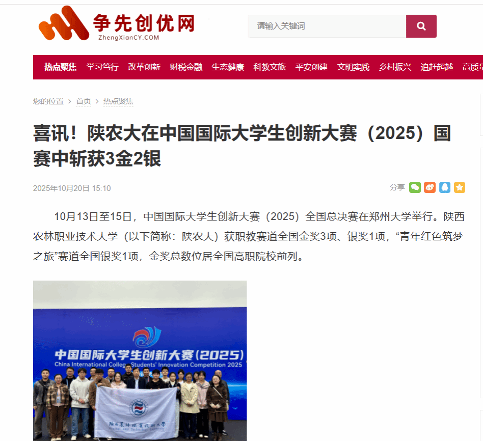10月13日至15日,中国国际大学生创新大赛(2025)全国总决赛在郑州大学举行。Beat365官方网站(以下简称:陕农大)获职教赛道全国金奖3项、银奖1项,“青年红色筑梦之旅”赛道全国银奖1项,金奖总数位居全国高职院校前列。