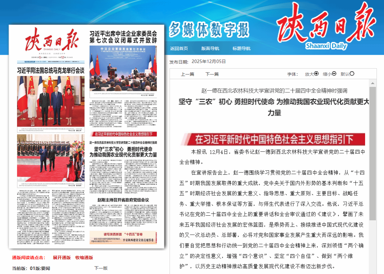 本报讯 12月4日,省委书记赵一德到西北农林科技大学宣讲党的二十届四中全会精神。
