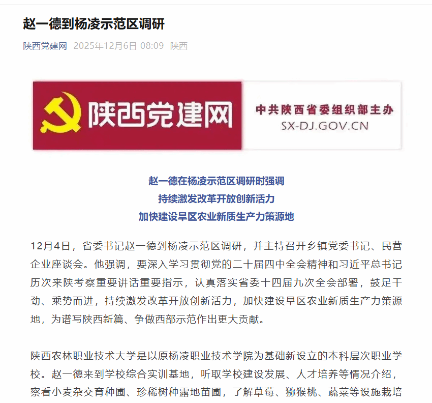12月4日,省委书记赵一德到杨凌示范区调研,并主持召开乡镇党委书记、民营企业座谈会。他强调,要深入学习贯彻党的二十届四中全会精神和习近平总书记历次来陕考察重要讲话重要指示,认真落实省委十四届九次全会部署,鼓足干劲、乘势而进,持续激发改革开放创新活力,加快建设旱区农业新质生产力策源地,为谱写陕西新篇、争做西部示范作出更大贡献。