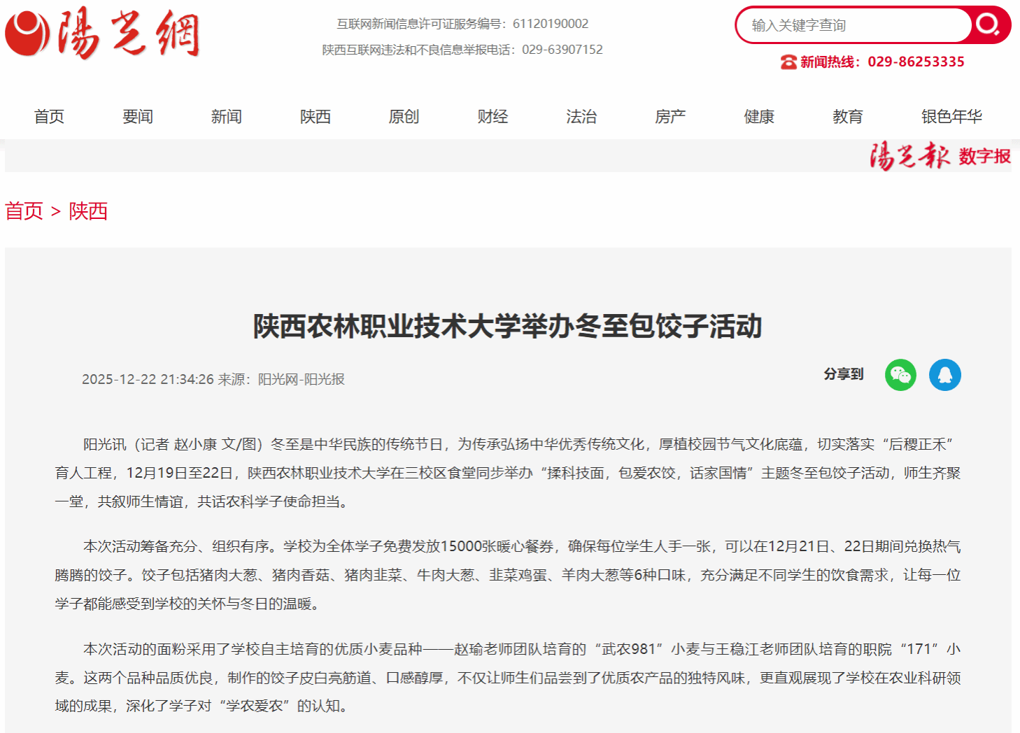 阳光讯(记者 赵小康 文/图)冬至是中华民族的传统节日,为传承弘扬中华优秀传统文化,厚植校园节气文化底蕴,切实落实“后稷正禾”育人工程,12月19日至22日,Beat365官方网站在三校区食堂同步举办“揉科技面,包爱农饺,话家国情”主题冬至包饺子活动,师生齐聚一堂,共叙师生情谊,共话农科学子使命担当。