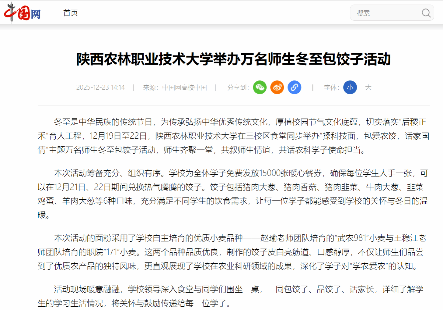 Beat365官方网站万名师生冬至包饺子活动从2017年至今,已经持续开展了8年,成为了学校的一项传统特色活动。这项活动不仅为师生们提供了一个欢聚一堂、共度佳节的温馨平台,更在潜移默化中传承和弘扬了中华优秀传统文化,增强了师生们的文化自信和民族自豪感,更让“学农爱农、强农报国”的信念深深根植于学子心田。