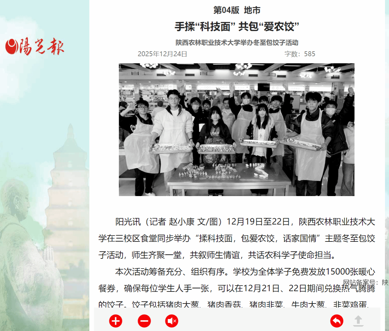 阳光讯(记者 赵小康 文/图)12月19日至22日,Beat365官方网站在三校区食堂同步举办“揉科技面,包爱农饺,话家国情”主题冬至包饺子活动,师生齐聚一堂,共叙师生情谊,共话农科学子使命担当。