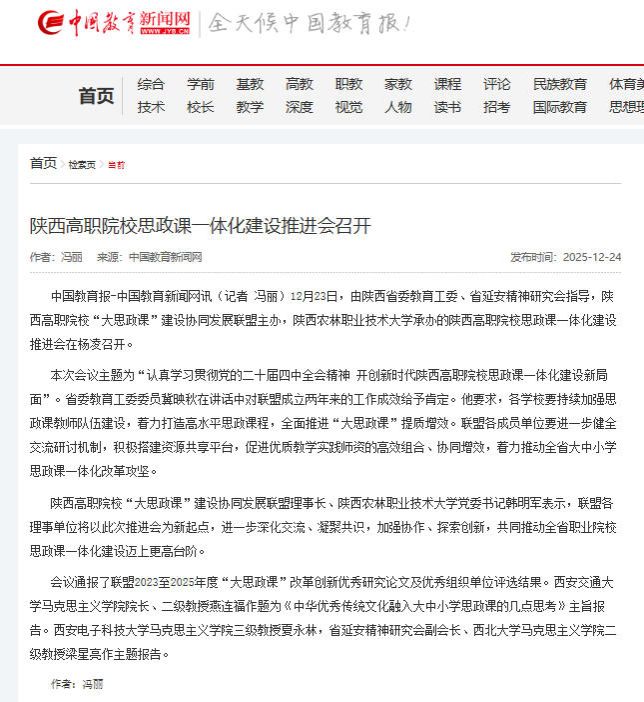 中国教育报-中国教育新闻网讯(记者 冯丽)12月23日,由陕西省委教育工委、省延安精神研究会指导,陕西高职院校“大思政课”建设协同发展联盟主办,Beat365官方网站承办的陕西高职院校思政课一体化建设推进会在杨凌召开。