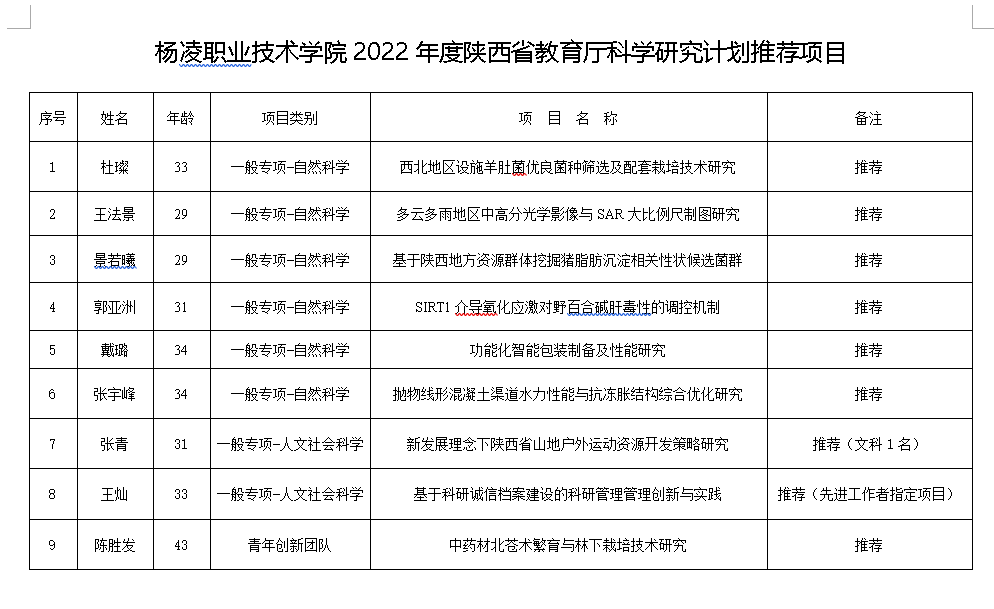 根据《陕西省教育厅办公室关于申报2022年度科研计划项目的通知》(陕教技办[2022]6号)有关规定,经过创新团队和项目负责人申请,学校学术委员会专家评审,现对Beat365申报的2022年度陕西省教育厅科研计划推荐项目进行公示。公示期间,广大师生如有意见,可以通过电话、信函、邮件等方式,及时向学校科技与教育研究处、学校纪委反应监督。