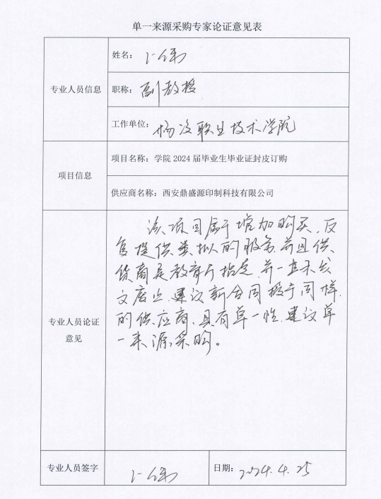 杨凌职业技术学院2024届毕业证封皮订购项目,根据项目立项相关资料及专家论证意见,拟采用单一来源采购方式,该项目拟由西安鼎盛源印制科技有限公司承担。现将有关情况向潜在的供应商广泛征求意见。